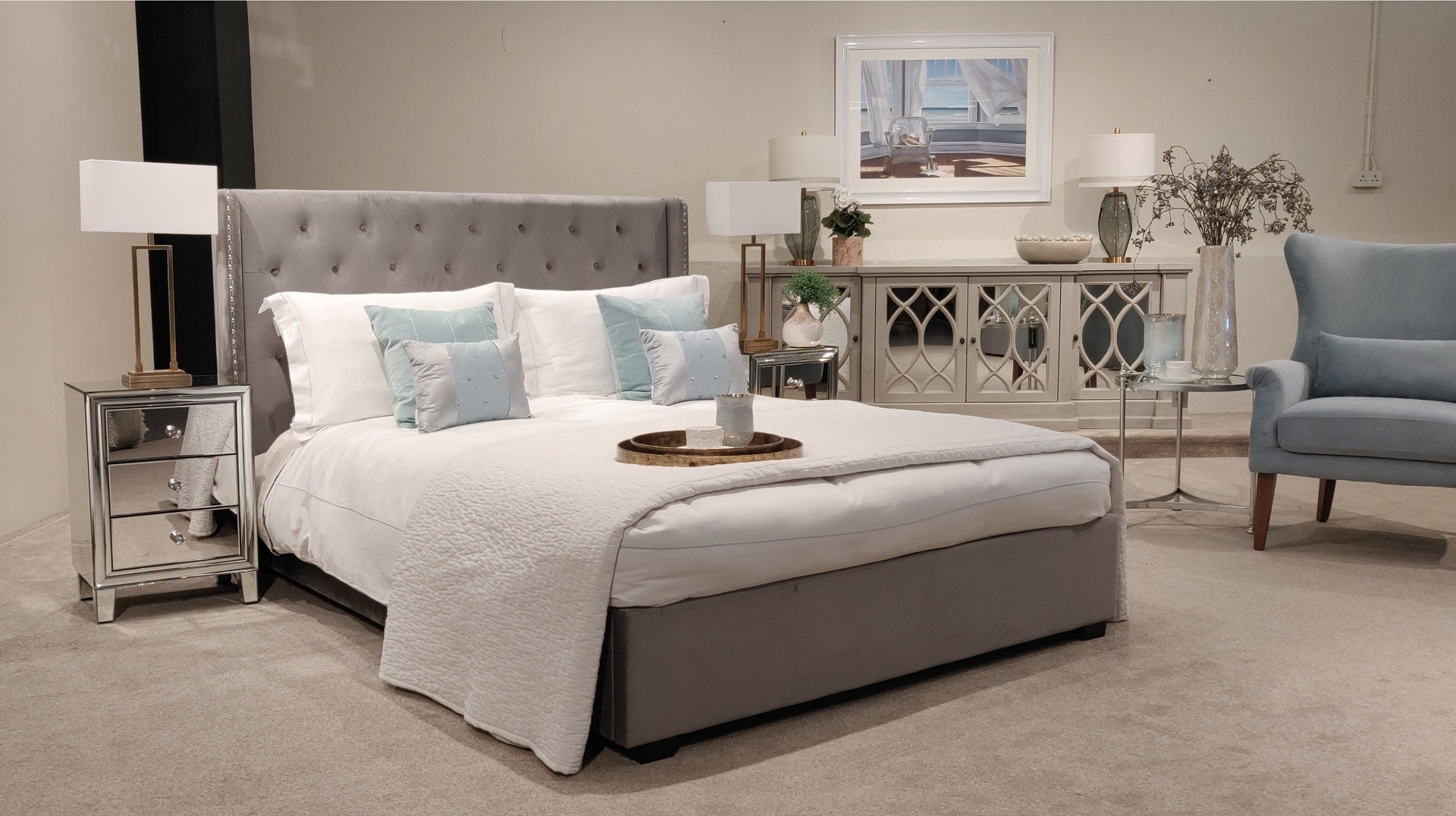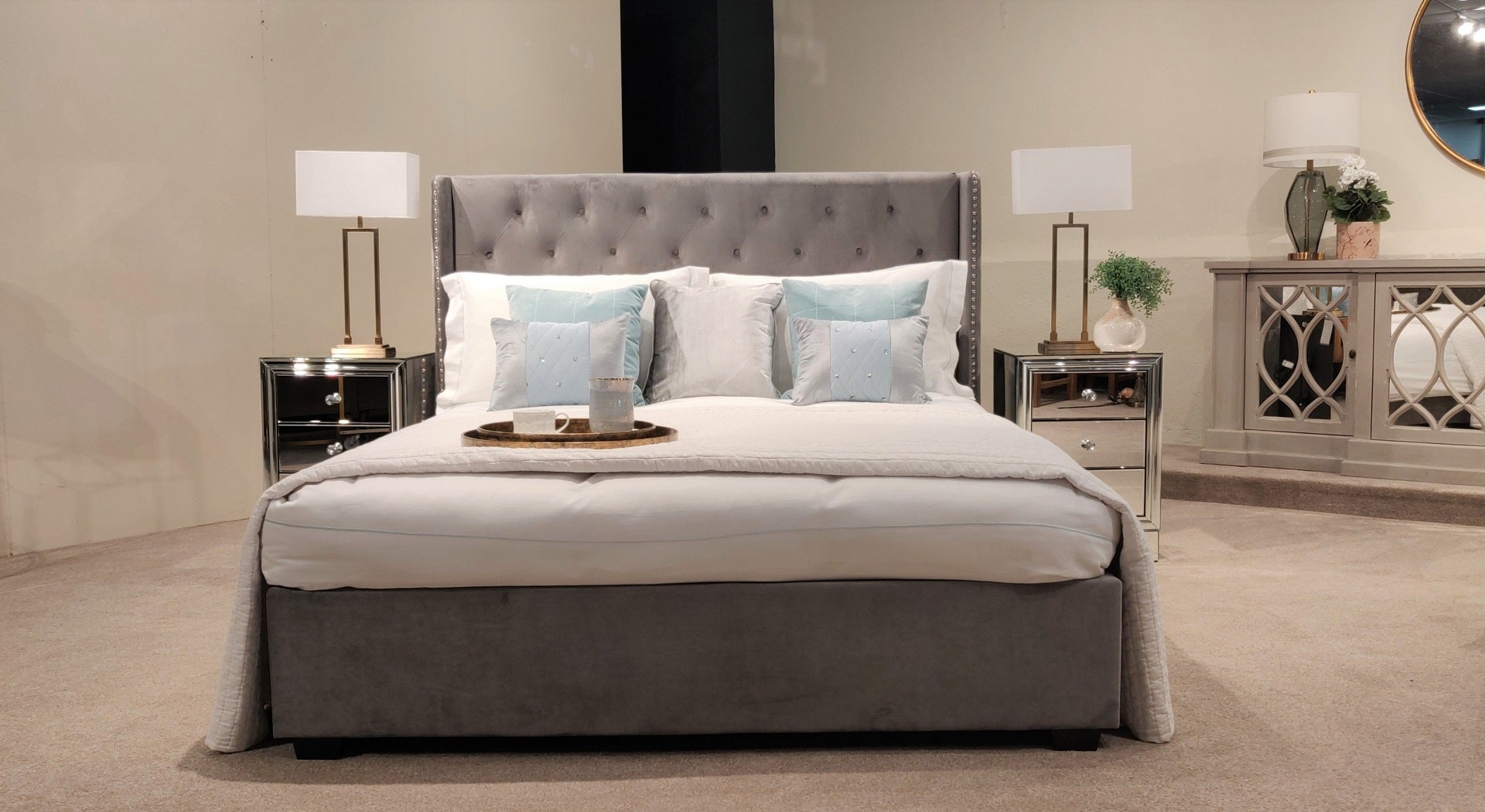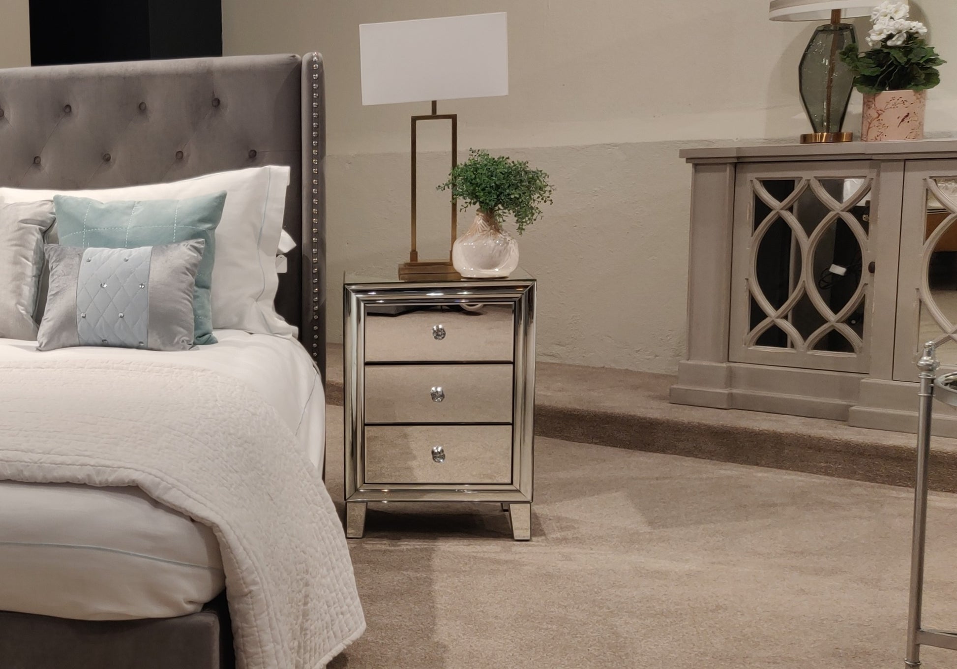 Mirrored Bedside table with 3 mirror fronted drawers on metal runners; mirrored top, front, sides and feet; black painted drawer interior and black back.