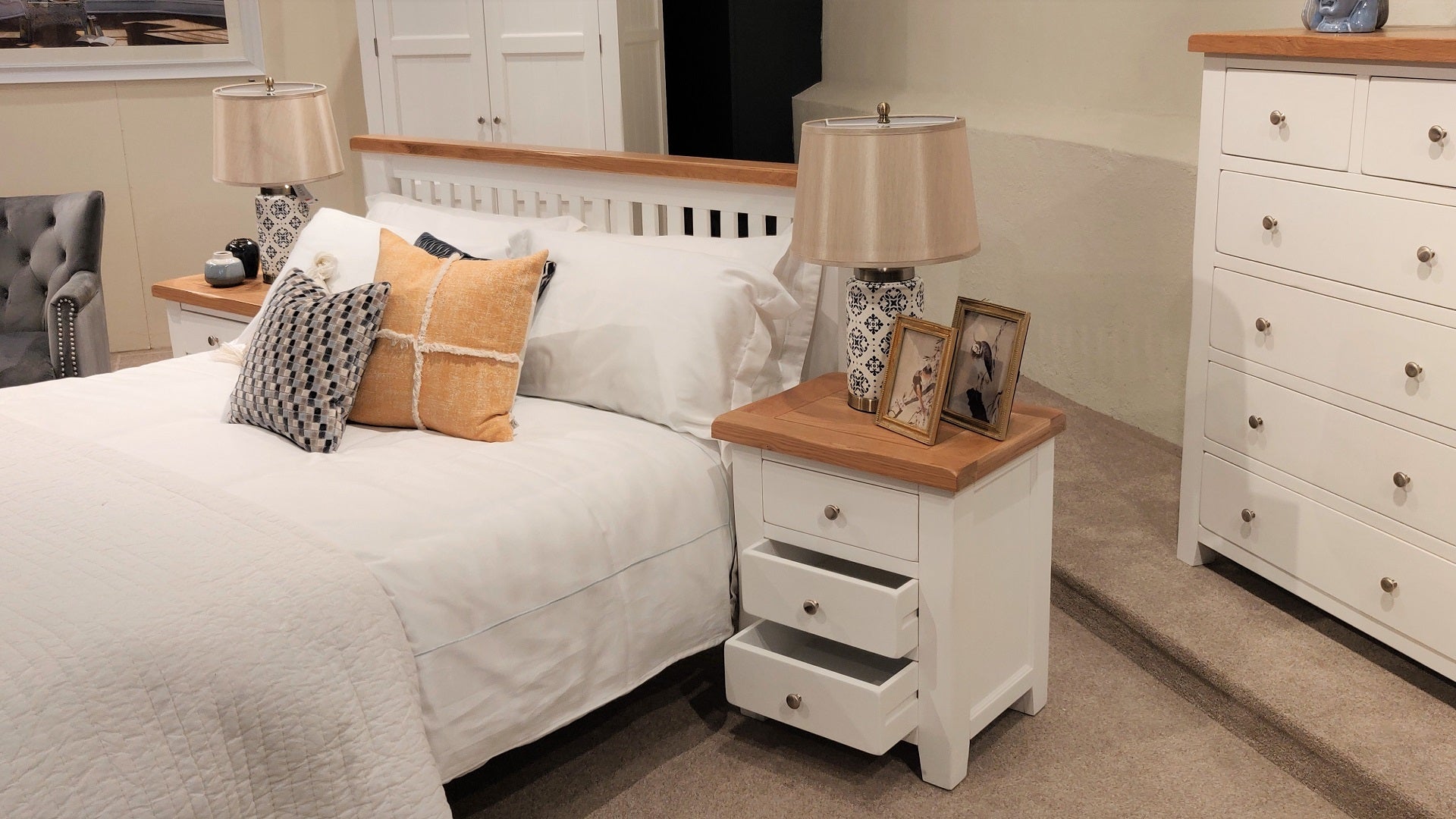 This stylish Oak and white bedside table oozes country charm with a hint of modernity. The classic two tone style of Oak top and painted white surfaces give that unmistakable farmhouse chic look and feel. Boasting three spacious drawers with brushed metal knobs, this piece provides ample storage for your bedtime essentials. The Oak top sports subtle chamfered edges and corners which continue down each side. At the bottom, protective feet pads ensure your floors don't get any nasty scuffs or scrapes. We think this white bedside table looks great but teaming it with other items in the range will make your bedroom space look even better!