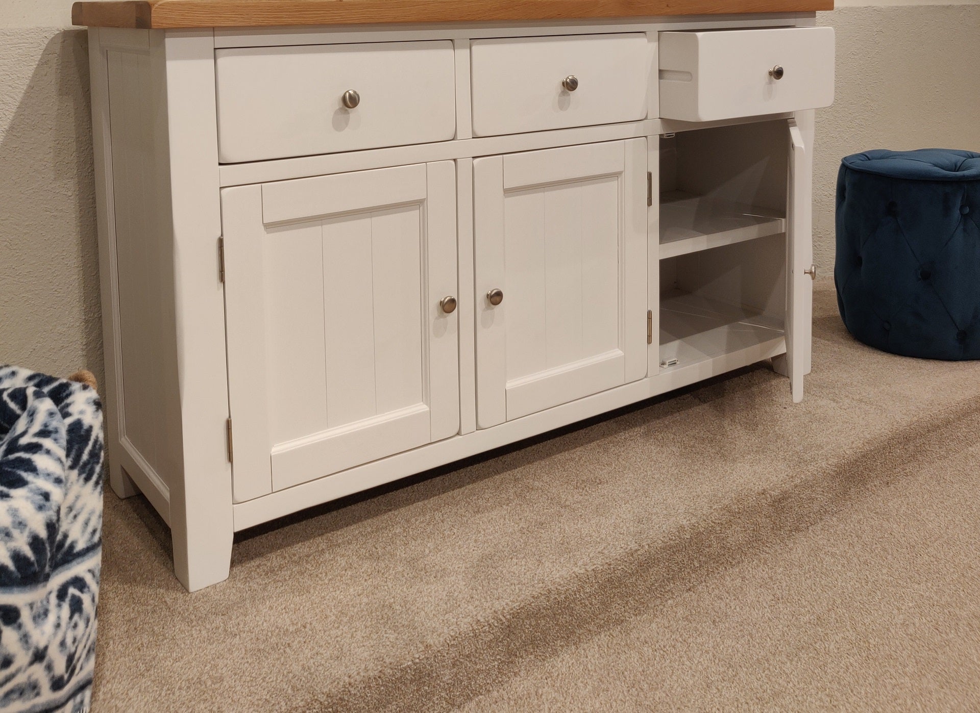 This stylish Oak and white large sideboard oozes country charm with a hint of modernity. The classic two tone style of Oak top and painted white surfaces give that unmistakable farmhouse chic look and feel. Boasting three spacious drawers with brushed metal knobs and two cupboards, this piece provides ample storage for your kitchen or diningroom essentials. The Oak top sports subtle chamfered edges and corners which continue down each side. At the bottom, protective feet pads ensure your floors don't get any nasty scuffs or scrapes. If the large sideboard is a touch on the large side for your space, there is the option of the smaller sideboard in this range. We think this white sideboard looks great but teaming it with other items in the range will make your kitchen or dining space look even better!