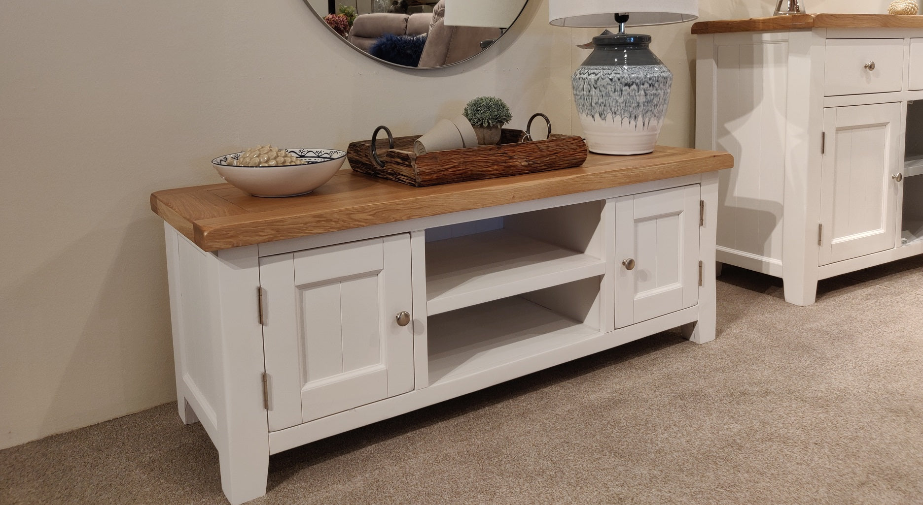 This stylish Oak two tone TV Unit oozes country charm with a hint of modernity. The classic two tone style of Oak top and painted white surfaces give that unmistakable farmhouse chic look and feel. Designed with two side compartments with brushed metal knobs and shelf for a gaming console or media player, this piece provides ample storage for your media and entertainment essentials. The Oak top which accommodates a 55 inch TV comfortably, sports subtle chamfered edges and corners which continue down each side. At the bottom, protective feet pads ensure your floors don't get any nasty scuffs or scrapes. We think this white TV Unit looks great but teaming it with other items in the range will make your living or dining space look even better!