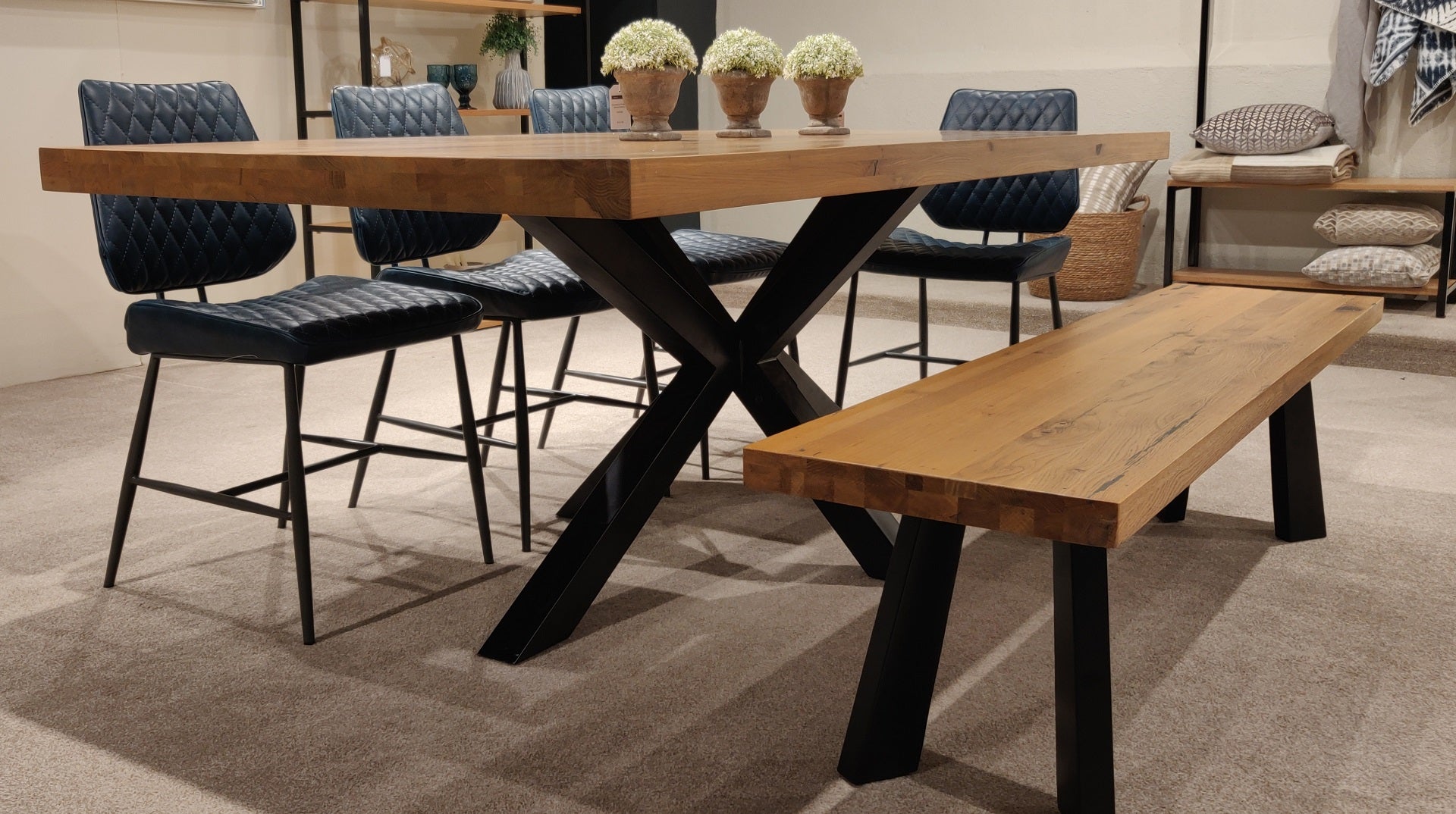 Beautiful large original oak dining table with chunky wooden top, fixed to a sturdy black steel star-frame base. The warmth that oak brings to a home interior is undeniable, and with the Texas dining table you get the added richness of an aged, reclaimed finish giving it an earthy and rustic feel. Can be paired with a 1.8 meter Texas oak bench seat, and with Dalton chairs as seen which we stock in both brown and ink blue shades.