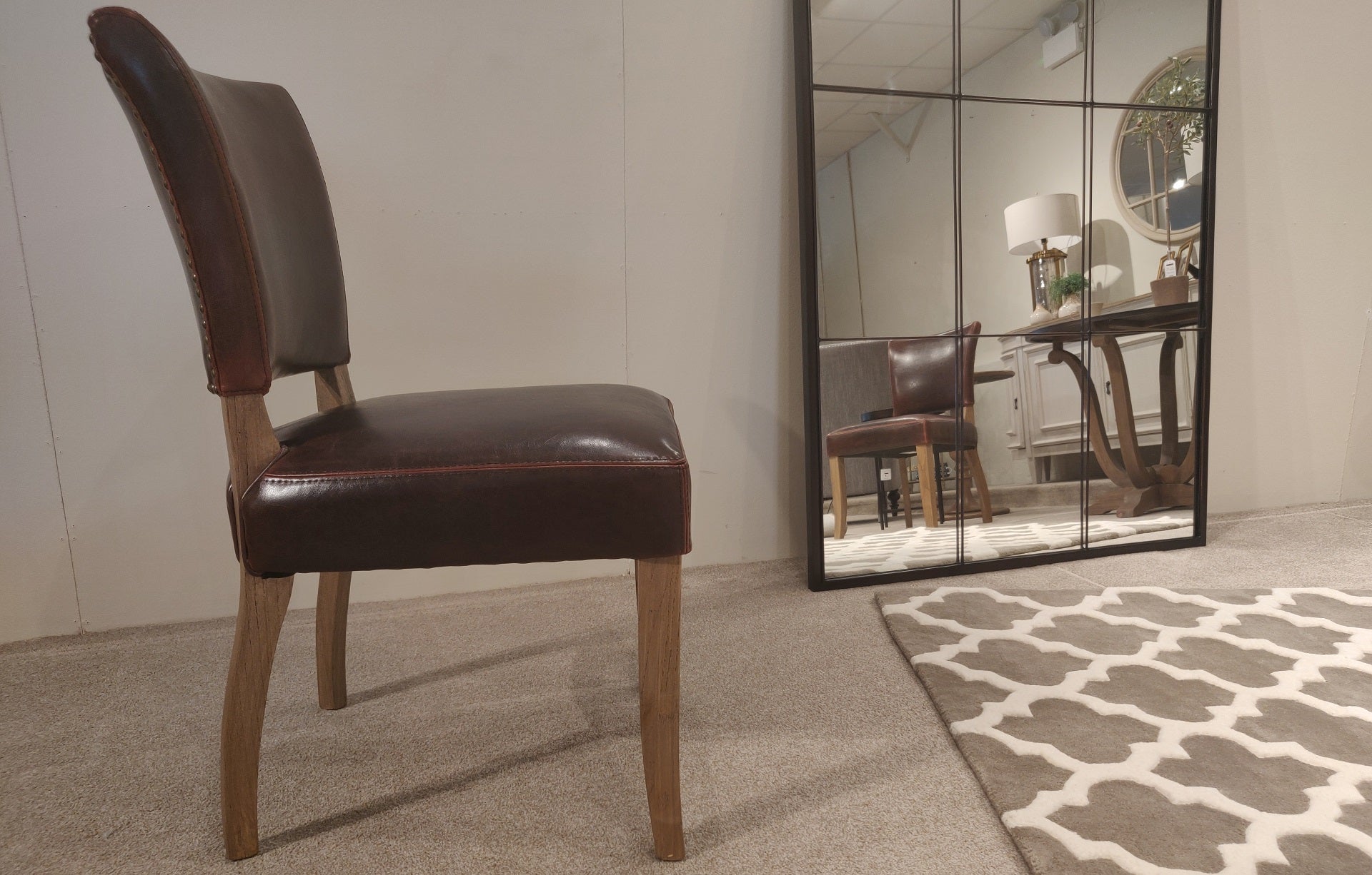Make a statement in your kitchen with this beautiful weathered Oak dining chair. An extremely comfortable seat and backrest is upholstered in stylish leather. At the back, studded trim gives this leather dining chair its stunning appearance, whilst at the bottom, solid Oak legs curve slightly to give an elegant look. As with all Oak timber, the beautiful grain comes through to give this chair its character and it's ideally suited to the traditional dining or kitchen space.