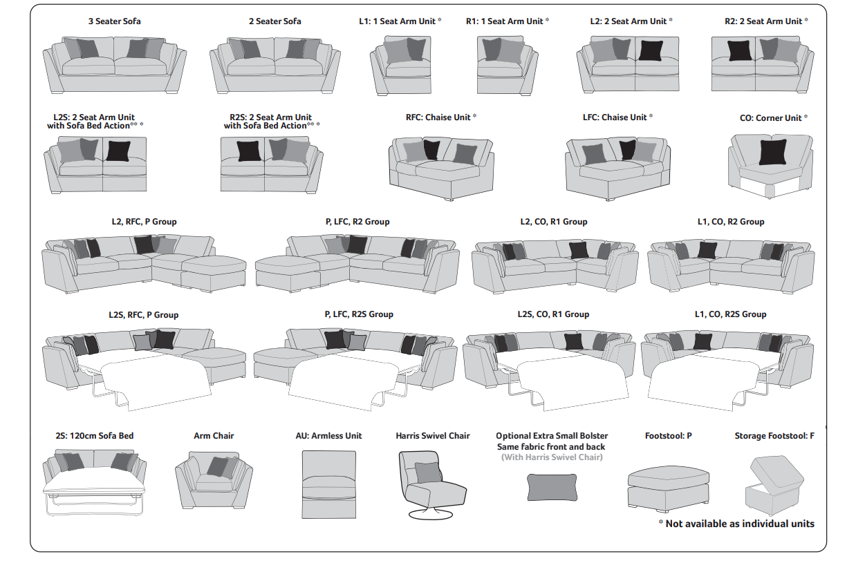 Available to order in Left arm Facing or Right arm facing; and in a range of other fabrics; with complimentary cushions included in the price as shown in line drawing sketches.